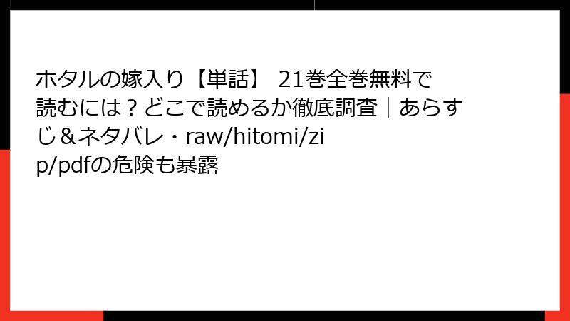 人気漫画「ホタルの嫁入り」を、raw、hitomi、zip、pdf、漫画バンクなどの海賊版サイトで読む行為は、一見手軽に思えますが、多大なリスクを伴います。この記事では、そうしたサイトを利用する法的、セキュリティ、経済的、品質的な問題点を詳しく解説します。海賊版はクリエイターの権利を侵害し、自身にも危害を及ぼす可能性が高いため、正規ルートでの購読をおすすめします。以下で、各リスクを深掘りします。