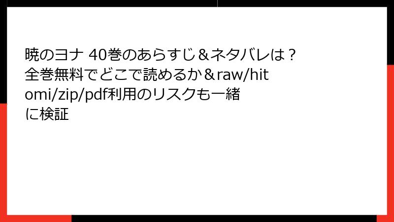 人気漫画「暁のヨナ」を、raw、hitomi、zip、pdf、漫画バンクなどの海賊版サイトで読むことは、一見便利に思えるかもしれません。しかし、これらのサイトを利用する行為は深刻なリスクを伴います。この記事では、法的、セキュリティ、品質、倫理的・経済的な観点から詳しく解説します。無料で楽しむ裏側に潜む危険を理解し、正規の方法で作品をサポートしましょう。