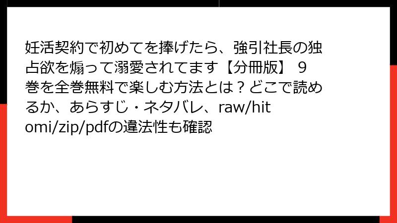 妊活契約で初めてを捧げたら、強引社長の独占欲を煽って溺愛されてます【分冊版】 9巻を全巻無料で楽しむ方法とは?どこで読めるか、あらすじ・ネタバレ、raw/hitomi/zip/pdfの違法性も確認