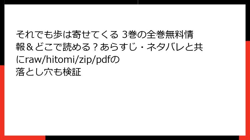 人気ラブコメ漫画「それでも歩は寄せてくる」を、raw、hitomi、zip、pdf、漫画バンクなどの海賊版サイトで無料で読もうと考える人もいるかもしれません。しかし、これらのサイトを利用することは多大な危険を伴います。この記事では、海賊版サイトの利用がもたらすさまざまなリスクを詳しく解説します。法的問題からセキュリティの脅威まで、読み応えのある形で掘り下げます。海賊版は一見便利ですが、結果として自分自身やクリエイターに深刻な害を及ぼす可能性が高いのです。