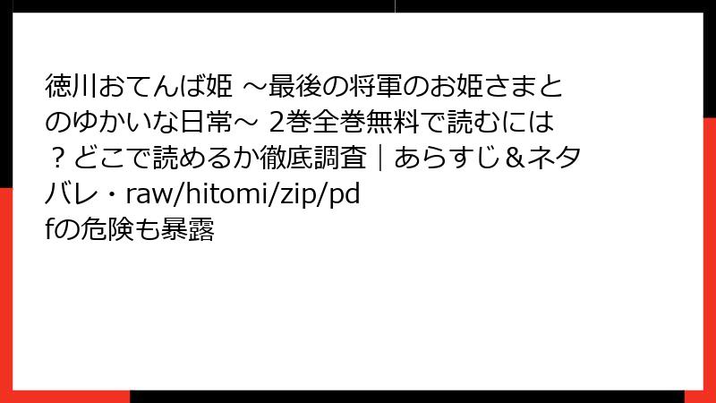 人気漫画「徳川おてんば姫 ~最後の将軍のお姫さまとのゆかいな日常~」を、raw/hitomi/zip/pdf/漫画バンクなどの海賊版サイトで無料で読もうとする人は少なくありません。しかし、これらのサイトを利用することは、単なる「便利な選択」ではなく、深刻なリスクを伴います。この記事では、法的側面からセキュリティ、品質、倫理的影響までを詳しく解説します。公式ルートで楽しむ重要性を再認識しましょう。