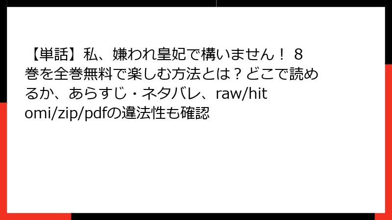 raw、hitomi、zip、pdf、漫画バンクなどの海賊版サイトで「私、嫌われ皇妃で構いません!」を読むのは、法的・セキュリティ・経済的なリスクが大きすぎます。これらのサイトは一時的な無料の代償として、長期的な被害を招く可能性が高いです。