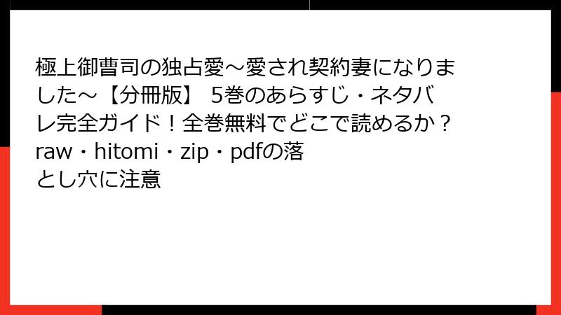 人気ロマンスコミック「極上御曹司の独占愛~愛され契約妻になりました~【分冊版】5巻」を、raw、hitomi、zip、pdf、漫画バンクなどの海賊版サイトで無料で読もうとする人は少なくありません。しかし、これらのサイトを利用することは、法的・セキュリティ面で深刻なリスクを伴います。この記事では、海賊版サイトの利用がもたらすさまざまな危険性を詳しく解説します。違法行為を避け、正規のプラットフォームで楽しむことを強くおすすめします。海賊版は一時的な無料さに見合わない大きな代償を払う可能性があるのです。