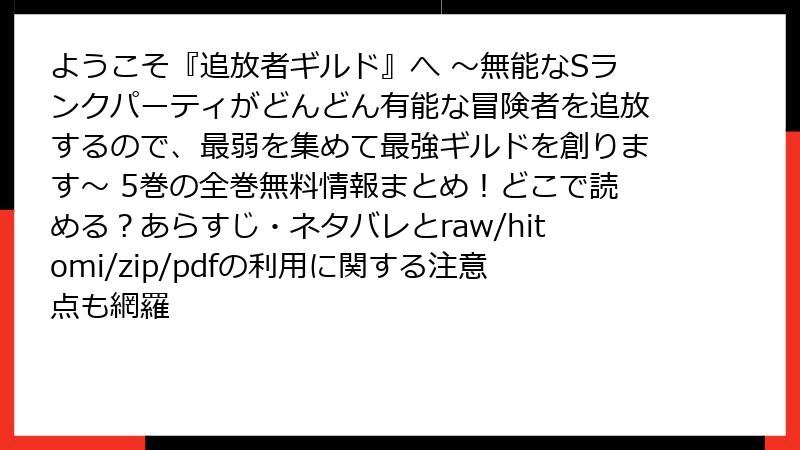 ようこそ『追放者ギルド』へ ~無能なSランクパーティがどんどん有能な冒険者を追放するので、最弱を集めて最強ギルドを創ります~ 5巻の全巻無料情報まとめ!どこで読める?あらすじ・ネタバレとraw/hitomi/zip/pdfの利用に関する注意点も網羅