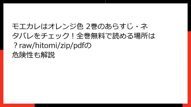 「モエカレはオレンジ色」のような人気漫画を、raw、hitomi、zip、pdf、漫画バンクなどの海賊版サイトで無料で読もうとする人は少なくありません。これらのサイトは、著作権者の許可なく漫画を無断アップロードしており、違法に配信されています。利用者は一見無料で楽しめそうですが、実際には深刻なリスクが伴います。多くの場合、これらのサイトは海外サーバーを利用し、頻繁にドメインを変えて運営を続けていますが、利用者が知らずに巻き込まれる危険性が高いのです。