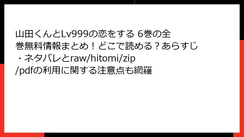 raw、hitomi、zip、pdf、漫画バンクなどの海賊版サイトで「山田くんとLv999の恋をする」6巻を読むのは、法的・セキュリティ・経済的・倫理的な多大なリスクを伴います。これらの危険を避けるため、正規の電子書籍サービスや書店を利用しましょう。初回割引やポイント還元を活用すれば、リーズナブルに楽しめます。リスクを理解し、安全に漫画ライフを満喫してください。
