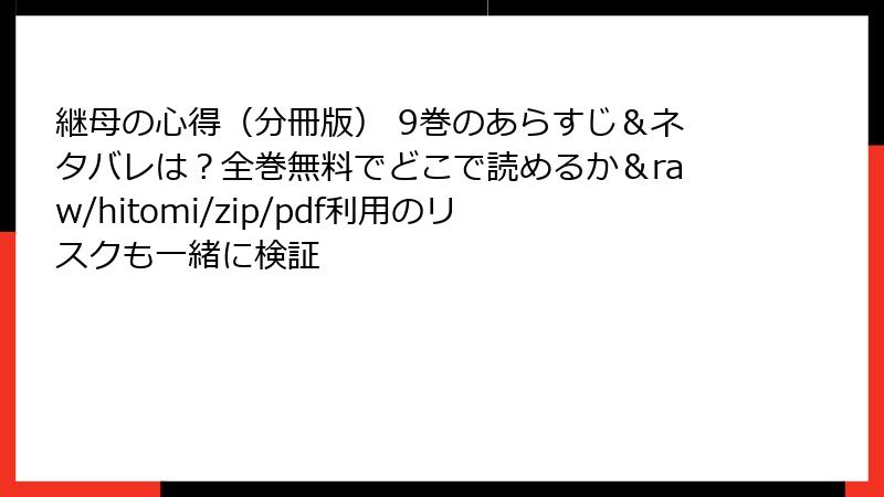 raw、hitomi、zip、pdf、漫画バンクなどの海賊版サイトで「継母の心得(分冊版) 9巻」を読むのは、法的・セキュリティ・経済的・倫理的なリスクが大きすぎます。代わりに、電子書籍プラットフォームで購入やレンタルすることをおすすめします。これにより、クリエイターを支援し、自分自身を守ることができます。安全第一で、漫画の世界を満喫しましょう。