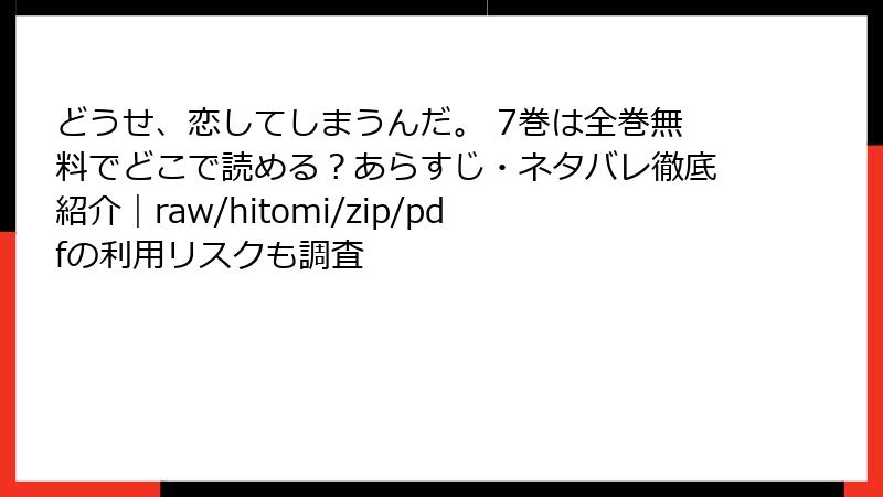 人気の青春ラブストーリー漫画「どうせ、恋してしまうんだ。」を楽しみたいと思っている読者の中には、raw、hitomi、zip、pdf、漫画バンクなどの海賊版サイトで無料で読もうと考える人もいるかもしれません。しかし、これらのサイトを利用することは多大なリスクを伴います。この記事では、法的・セキュリティ面を中心に、海賊版サイトの危険性を詳しく解説します。違法行為を避け、正規の方法で作品を楽しむことを強くおすすめします。未成年者や初心者の方は特に注意が必要です。