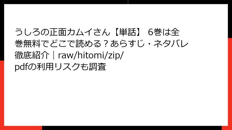 人気のエロコメディホラー漫画「うしろの正面カムイさん」を、raw/hitomi/zip/pdf/漫画バンクなどの海賊版サイトで読むのは、一見手軽に思えるかもしれません。しかし、これらのサイトを利用する行為は、さまざまな深刻なリスクを伴います。この記事では、法的、セキュリティ、品質、倫理的、経済的な観点から詳しく解説します。海賊版の利用は避け、正規のプラットフォームで楽しむことを強くおすすめします。