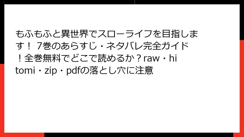 『もふもふと異世界でスローライフを目指します!』のような人気異世界スローライフ漫画を、rawサイト、hitomi、zipやpdf配布サイト、漫画バンク系などの海賊版プラットフォームで読む行為は、一見手軽に見えますが、複数の深刻なリスクを伴います。これらのサイトは著作権者の許可なくコンテンツを無断で公開しており、利用者自身も法的に危険な立場に置かれます。