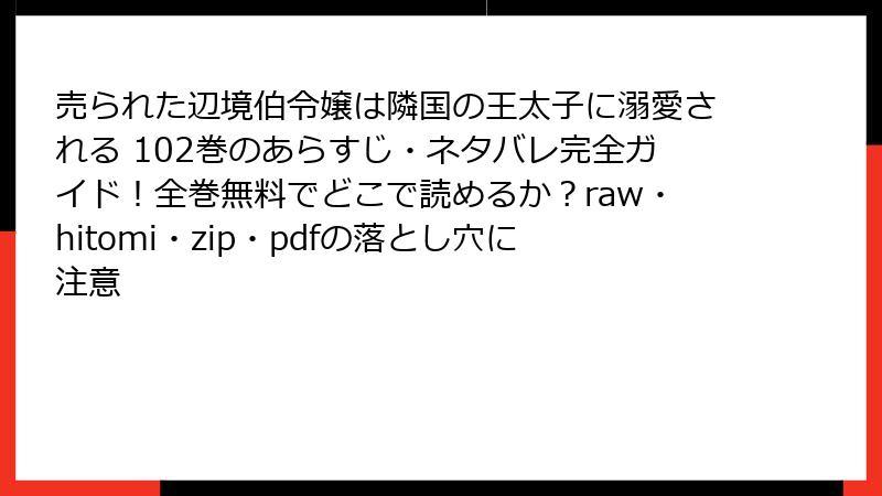 人気漫画「売られた辺境伯令嬢は隣国の王太子に溺愛される」を、raw、hitomi、zip、pdf、漫画バンクなどの海賊版サイトで読むのは一見手軽ですが、さまざまなリスクが伴います。これらのサイトは著作権を無視した違法アップロードが主流で、利用者は知らず知らずのうちに問題に巻き込まれる可能性があります。以下で法的、セキュリティ、品質、倫理的側面から詳しく解説します。