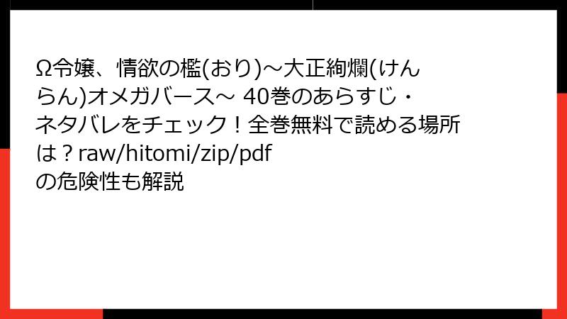 『Ω令嬢、情欲の檻~大正絢爛オメガバース~』をraw/hitomi/zip/pdf/漫画バンクで読むリスクは、法的・セキュリティ・プライバシー・倫理の観点から深刻です。これらのサイトは一時的な無料を餌に、長期的な被害を招きます。代わりに正規プラットフォームを利用し、作者をサポートしましょう。安全第一で、漫画の魅力を存分に味わってください。