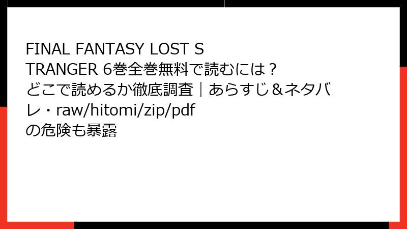- FINAL FANTASY LOST STRANGER をraw・hitomi・ZIP・PDF・漫画バンクなどの海賊版サイトで読むリスクを徹底解説! 法的・セキュリティ・倫理の全危険性