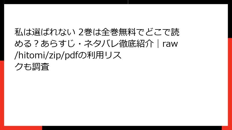 人気の恋愛ファンタジー漫画「私は選ばれない」を楽しむ際、正規ルート以外で入手しようとする人もいるかもしれません。しかし、海賊版サイト(raw、hitomi、zip、pdf、漫画バンクなど)を利用するのは、さまざまなリスクを伴います。この記事では、それらのリスクを詳しく解説します。法的問題からセキュリティの脅威まで、幅広く掘り下げてみましょう。海賊版は一時的な利便性を提供するかもしれませんが、長期的に見てデメリットが大きいことを理解してください。