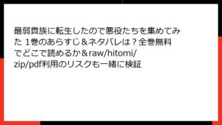 少年マンガ 最弱貴族に転生したので悪役たちを集めてみた 1巻のあらすじ&ネタバレは?全巻無料でどこで読めるか&raw/hitomi/zip/pdf利用のリスクも一緒に検証 最弱貴族に転生したので悪役たちを集めてみた 1巻:詳細あらすじレビュー こんにちは、漫画好きのブロガーです! 今日は、2025年5月に発売されたばかりの新作コミック「最弱貴族に転生したので悪役たちを集めてみた」1巻について、詳しくあらすじを... 2025.09.10 少年マンガ最弱貴族に転生したので悪役たちを集めてみた