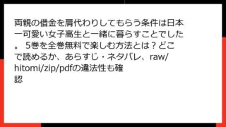 両親の借金を肩代わりしてもらう条件は日本一可愛い女子高生と一緒に暮らすことでした。 両親の借金を肩代わりしてもらう条件は日本一可愛い女子高生と一緒に暮らすことでした。 5巻を全巻無料で楽しむ方法とは?どこで読めるか、あらすじ・ネタバレ、raw/hitomi/zip/pdfの違法性も確認