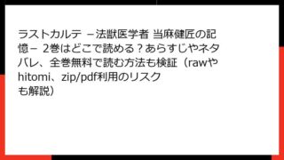 ラストカルテ -法獣医学者 当麻健匠の記憶- ラストカルテ -法獣医学者 当麻健匠の記憶- 2巻はどこで読める?あらすじやネタバレ、全巻無料で読む方法も検証(rawやhitomi、zip/pdf利用のリスクも解説)