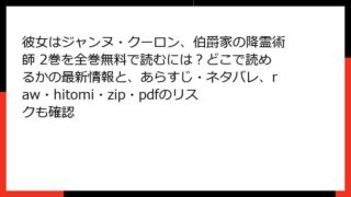 少女マンガ 彼女はジャンヌ・クーロン、伯爵家の降霊術師 2巻を全巻無料で読むには?どこで読めるかの最新情報と、あらすじ・ネタバレ、raw・hitomi・zip・pdfのリスクも確認 『彼女はジャンヌ・クーロン、伯爵家の降霊術師』2巻:独立独歩の最強令嬢、霊界の謎に挑む! みなさん、こんにちは! ファンタジー好きのブロガー、ミスティック・リーダーです。今日は、KADOKAWAから出版された注目のマンガ『彼女はジャンヌ・ク... 2025.10.08 少女マンガ彼女はジャンヌ・クーロン、伯爵家の降霊術師