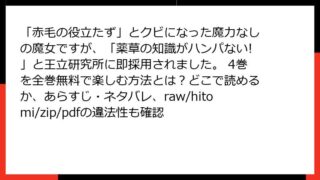 「赤毛の役立たず」とクビになった魔力なしの魔女ですが、「薬草の知識がハンパない!」と王立研究所に即採用されました。 「赤毛の役立たず」とクビになった魔力なしの魔女ですが、「薬草の知識がハンパない!」と王立研究所に即採用されました。 4巻を全巻無料で楽しむ方法とは?どこで読めるか、あらすじ・ネタバレ、raw/hitomi/zip/pdfの違法性も確認