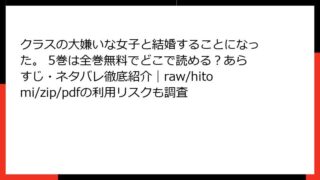 クラスの大嫌いな女子と結婚することになった。 クラスの大嫌いな女子と結婚することになった。 5巻は全巻無料でどこで読める?あらすじ・ネタバレ徹底紹介|raw/hitomi/zip/pdfの利用リスクも調査 『クラスの大嫌いな女子と結婚することになった。』5巻 徹底あらすじレビュー:相性最悪夫婦の絆が深まる胸キュン展開! こんにちは、漫画好きのブロガーです! 今日は、KADOKAWAから刊行されている人気ラブコメディ『クラスの大嫌いな女子と結婚... 2025.10.21 クラスの大嫌いな女子と結婚することになった。少年マンガ