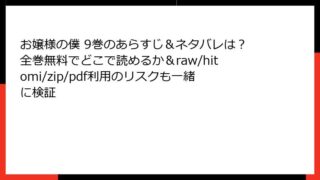 お嬢様の僕 お嬢様の僕 9巻のあらすじ&ネタバレは?全巻無料でどこで読めるか&raw/hitomi/zip/pdf利用のリスクも一緒に検証 『お嬢様の僕』9巻の魅力に迫る! 詳細あらすじと心揺さぶる展開を徹底解説 みなさん、こんにちは! ラブコメ好きの漫画ブロガー、です。今回は、田口ホシノ先生の人気作『お嬢様の僕』第9巻のあらすじを、ネタバレ満載で詳しくお届けします。この作品は... 2025.12.05 お嬢様の僕少年マンガ