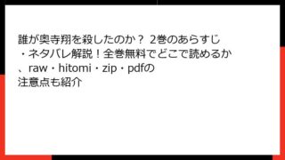 少年マンガ 誰が奥寺翔を殺したのか? 2巻のあらすじ・ネタバレ解説!全巻無料でどこで読めるか、raw・hitomi・zip・pdfの注意点も紹介 誰が奥寺翔を殺したのか? 2巻の詳細あらすじ この記事では、河田雄志原作、行徒作画の漫画「誰が奥寺翔を殺したのか?」の2巻について、詳細なあらすじをブログ形式でまとめます。1巻で転校生・奥寺翔の謎めいた過去が明かされ始め、クラスメートたちの... 2026.02.08 少年マンガ誰が奥寺翔を殺したのか?