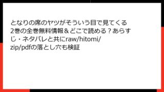 となりの席のヤツがそういう目で見てくる となりの席のヤツがそういう目で見てくる 2巻の全巻無料情報&どこで読める?あらすじ・ネタバレと共にraw/hitomi/zip/pdfの落とし穴も検証 となりの席のヤツがそういう目で見てくる 2巻 あらすじ詳解 物語の全体像と1巻からのつながり この漫画は、下心から始まる純愛ラブコメとして人気を博している作品です。主人公の池沢くんはサッカー部に所属する高校生で、隣の席の美少女・江口さんをお... 2026.02.11 となりの席のヤツがそういう目で見てくる少年マンガ