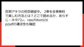 少年マンガ 百瀬アキラの初恋破綻中。 2巻を全巻無料で楽しむ方法とは?どこで読めるか、あらすじ・ネタバレ、raw/hitomi/zip/pdfの違法性も確認 百瀬アキラの初恋破綻中。 2巻のあらすじ 物語の背景と導入 ド田舎に暮らす少年・久我山はじめのもとに、かつての憧れの同級生・百瀬アキラが帰ってきます。アキラは、はじめと結ばれるために周到な計画を立てて田舎に戻ってきたのですが、彼女の超不器用... 2026.02.13 少年マンガ百瀬アキラの初恋破綻中。