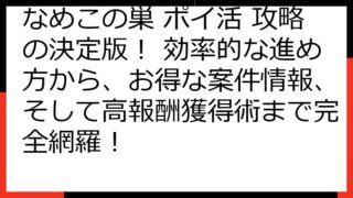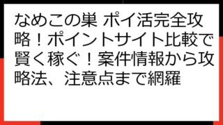 なめこの巣 ポイ活完全攻略! 効率的な進め方と高報酬獲得術 この記事では、「なめこの巣」のポイ活を徹底的に攻略するための情報を網羅しています。 ゲームを楽しみながら、お得にポイントを稼ぐ方法を詳しく解説します。 ポイ活の基本から、効率的なゲ...