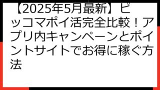 ピッコマ 【2025年5月最新】ピッコマポイ活完全比較!アプリ内キャンペーンとポイントサイトでお得に稼ぐ方法 【2025年5月最新】ピッコマポイ活完全比較!賢く稼ぐならこのサイト・案件 ピッコマでマンガを読むだけで、お小遣いが稼げるポイ活。 でも、「どのサイトがお得?」「どんな案件が一番稼げるの?」と悩んでいませんか? この記事では、2025年5月... 2026.01.27 ピッコマ
