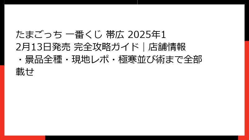 2025年12月13日発売の一番くじ たまごっちは、歴代キャラクターが勢揃いした超豪華ラインナップ!全8等級+ラストワン賞で構成されており、帯広エリアでは特に上位賞の争奪戦が熾烈を極めると予想されます。