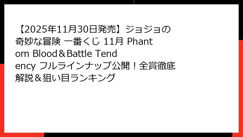 ジョジョファン待望の瞬間がやってきた!2025年11月21日夜、バンプレスト公式Twitterおよび一番くじ公式サイトにて大々的に発表された「一番くじ ジョジョの奇妙な冒険 Phantom Blood&Battle Tendency」が、2025年11月30日(土)より全国の取り扱い店舗にて順次発売開始されることが正式決定!!