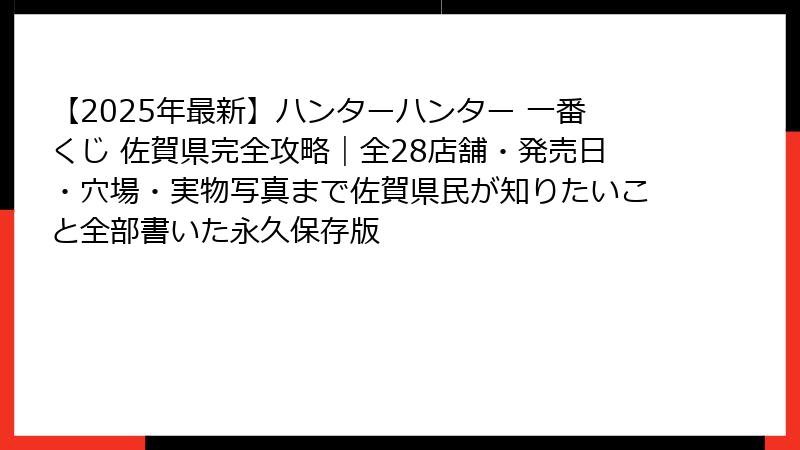 - 【2025年最新版】佐賀県でハンターハンター一番くじが買える全28店舗完全リスト&地域別攻略マップ【在庫数・並び人数・穴場度を全て公開】