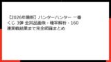 A賞からラストワン賞まで、希少価値の高いアイテムが揃い、ハンターハンター一番くじボマーはE賞として比較的入手しやすい位置づけです。