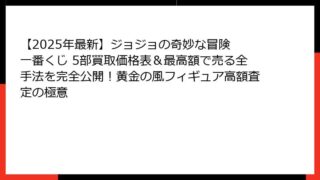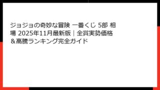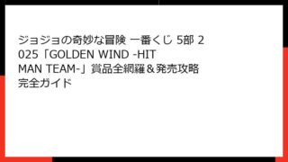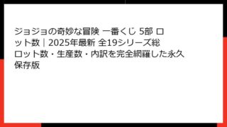 【2025年最新版】ジョジョの奇妙な冒険 第5部 一番くじ 全ロット数まとめ|歴代5部くじのロット数を完全網羅 「ジョジョの奇妙な冒険 第5部 一番くじ ロット数」で検索してここに辿り着いたあなたは、間違いなく本気の人です。 この記事は、2...