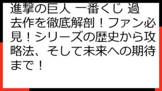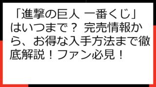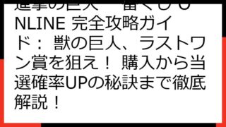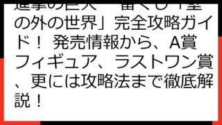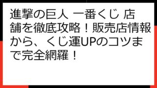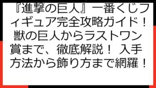 【徹底攻略】進撃の巨人 一番くじ エレン フィギュアを確実にゲット! 狙い目・入手方法・注意点まで完全網羅! この記事では、「進撃の巨人 一番くじ エレン」のフィギュアを確実に手に入れるための、情報を提供します。 一番くじの仕組みから、店舗...